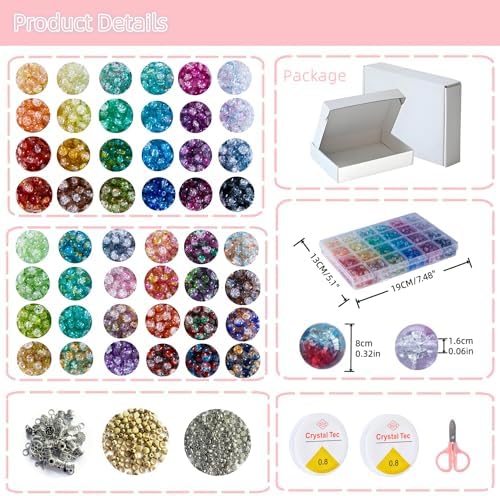 1300PCS 8mm Mixed Crackle Glass Beads for Bracelets Making with Accessories, 48 Colors Crystal Glass Beads Jewelry Making Kit, Round Beads for DIY Bracelet Crafts